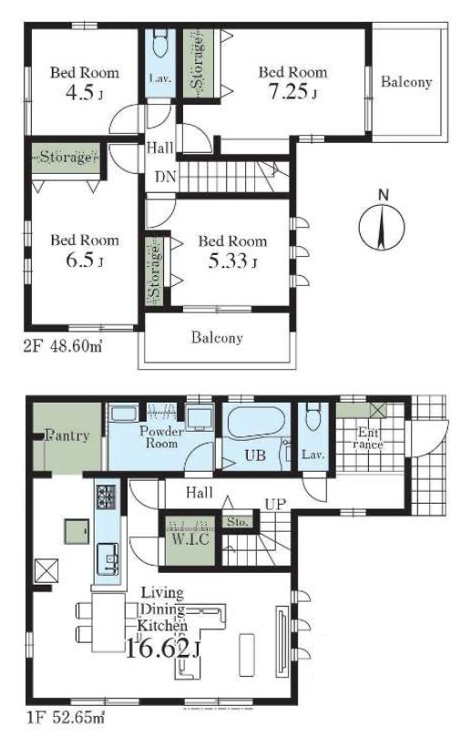 ・パントリー・ウォークインクローゼット・各室収納など収納豊富、奥行きのあるバルコニー付きの4LDK。